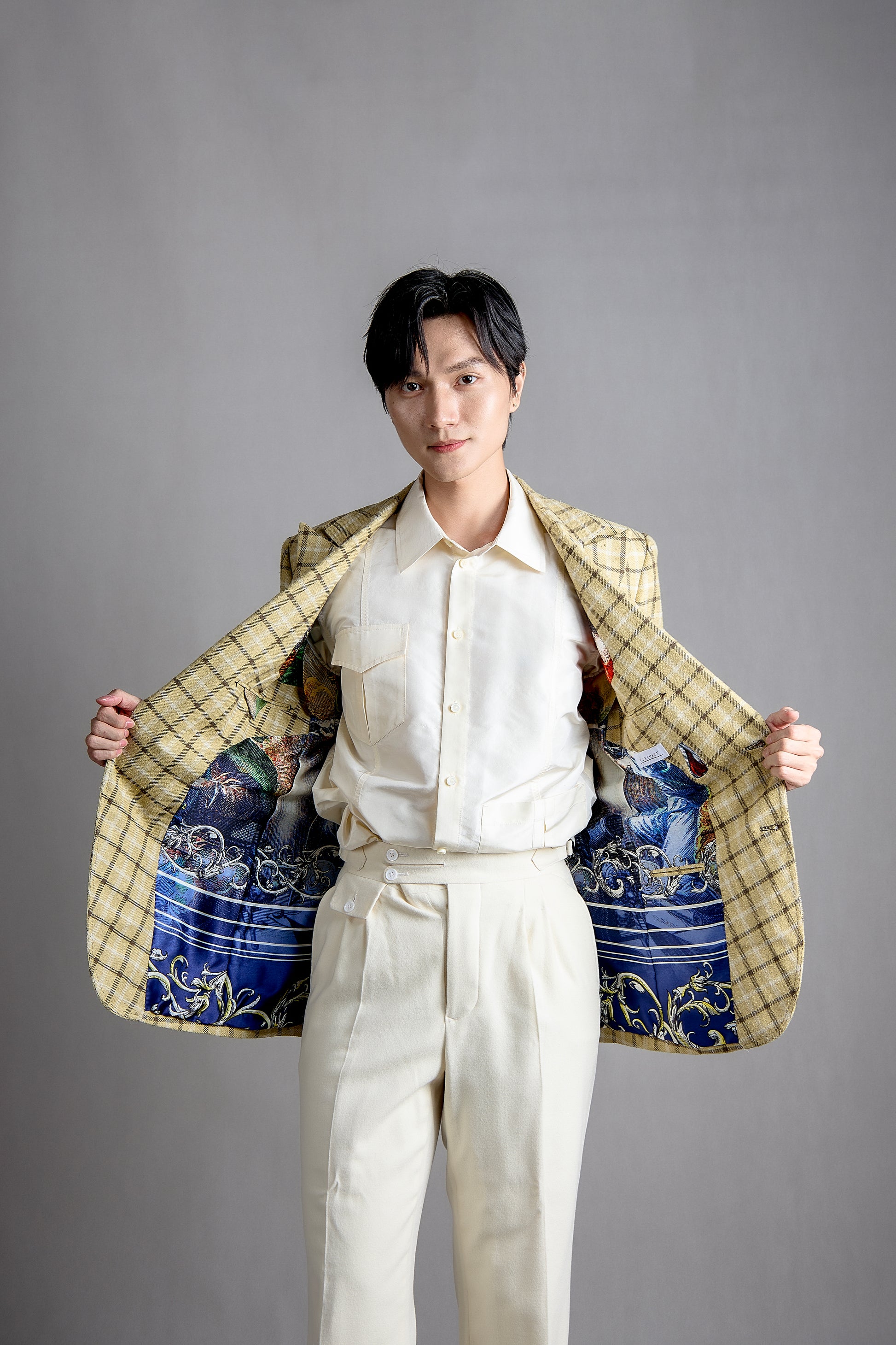 The full canvas construction—a hallmark of masterful tailoring—ensures a superior fit that molds to your body over time, enhancing both comfort and style. Unlike fused suits, the full canvas technique uses layers of natural materials, allowing the suit to breathe, move gracefully, and maintain its impeccable structure for years to come. Paired with the breathable, lightweight quality of Tussah silk, this suit offers an experience of unmatched refinement and freedom.